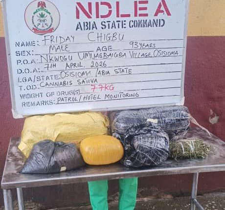 In one of such operations, a nonagenarian Pa Friday Ahukanna Chigbu was arrested at his home in Umuagbaigba, Amavo Nkwogu village, Osisioma local government area of Abia state on Tuesday 7th April 2026. A search of his residence led to the recovery of 7.7 kilograms of skunk, a strain of cannabis. The suspect claimed he had worked as a truck pusher but later learnt painting and tiling before going into the illicit drug business over a year ago. He claimed he had been smoking skunk since 1959 before turning it into business.