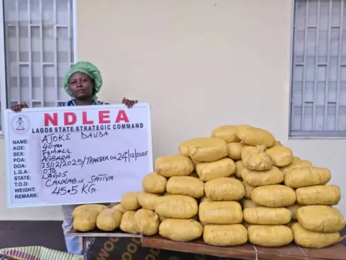 Meanwhile, NDLEA operatives in Oyo state on Monday 29th December 2025 arrested a wanted female drug kingpin who is a major illicit drug distributor in Ibadan, the state capital. The 65-year-old grandma, Fatima Ilori, popularly known as Mama Kerosine was nabbed in an intelligence-led operation following the seizure of 238.4kg skunk, a strain of cannabis, linked to her. She was arrested along with another female suspect Olusanya Abosede, 35, at Onireke/Elekuro area of Ibadan.
