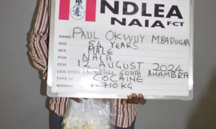 A Vietnam-bound businessman, Paul Okwuy Mbadugha has been arrested by operatives of the National Drug Law Enforcement Agency, NDLEA, at the Nnamdi Azikiwe International Airport, NAIA, Abuja after he tested positive to ingestion of cocaine. The 54-year-old suspect was intercepted at the boarding gate of the Abuja airport on Monday 12th August 2024 during the outward clearance of Qatar Airways flight QR 1432 to Hanoi, Vietnam via Doha. After four days under excretion observation, Mbadugha egested a total of 88 wraps of the illicit drug with a gross weight of 1.710 kilograms. In his statement, he claimed he’s a Lagos based businessman and was given the cocaine pellets to swallow by a friend at Isolo area of the state for onward delivery in Vietnam for a fee of $2,000.