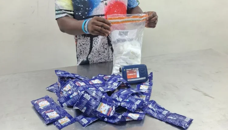 A notorious drug trafficker Nwobodo Chidiebere Basil previously convicted of dealing in 30.10kg methamphetamine in 2023 has again been arrested by operatives of the National Drug Law Enforcement Agency (NDLEA) following the seizure of 75 parcels of cocaine weighing 1.50 kilograms concealed in factory sealed sachets of cold-water starch heading to the United Kingdom at the export shed of the Murtala Muhammed International Airport (MMIA) Ikeja Lagos.