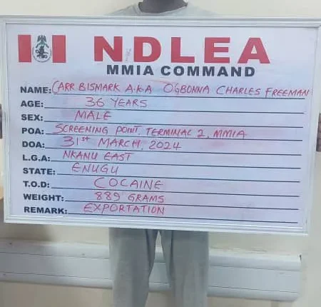 Three months after vomiting and excreting eighty (80) wraps of cocaine following his arrest by operatives of the National Drug Law Enforcement Agency, NDLEA, at the screening point of terminal 2 of the Murtala Muhammed International Airport, MMIA Ikeja Lagos, a Delhi, India-bound passenger, Freeman Charles Ogbonna, has been sentenced to twenty-five (25) years imprisonment by a Federal High Court.