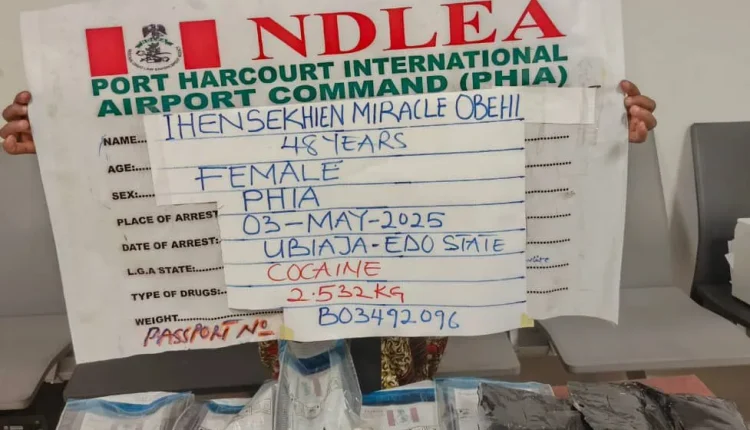 Desperate attempt by a woman, Ihensekhien Miracle Obehi who disguised with hijab to export large consignments of cocaine concealed in her private part, stomach and false bottom of her handbag to Iran has been thwarted by operatives of the National Drug Law Enforcement Agency (NDLEA) at the Port Harcourt International Airport, Port Harcourt, Rivers state.Obehi who was dressed in hijab to beat security checks was intercepted at the departure hall of the Port Harcourt airport on Sunday 3rd May 2025 while trying to board a Qatar Airline flight to Iran via Doha following credible intelligence.