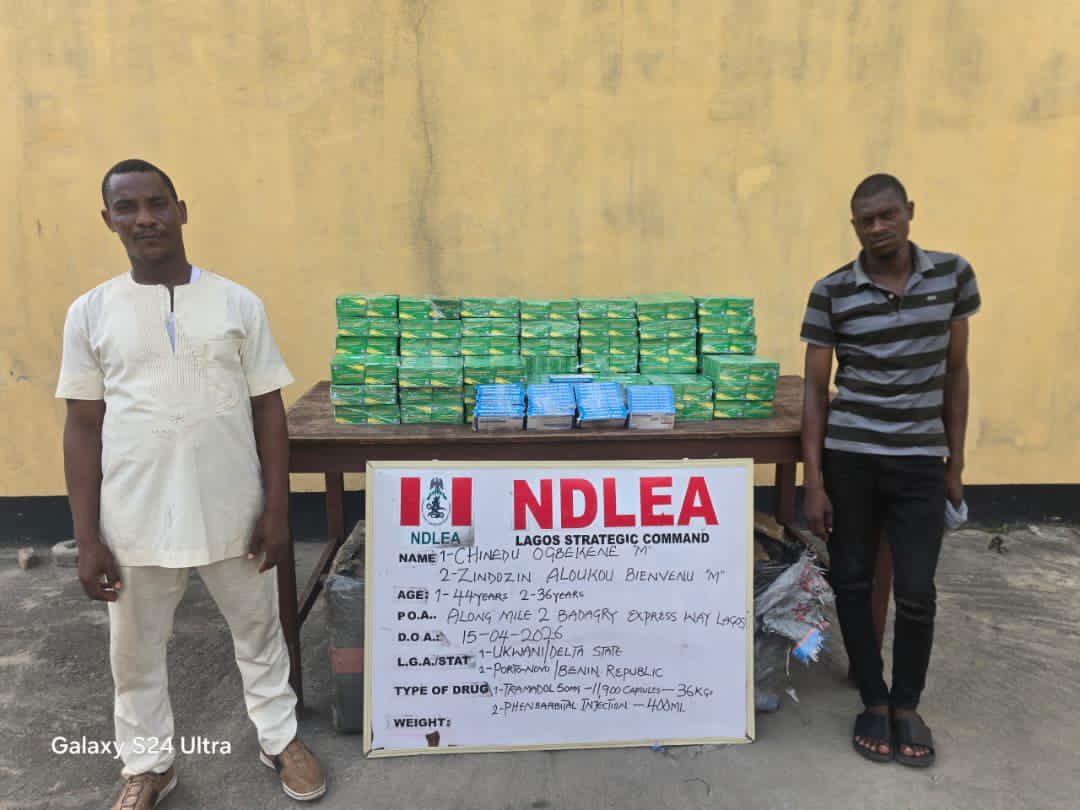 In Lagos, two suspects: Chinedu Ogbekene and Zindozin Aloukou Bienvenu were arrested on Wednesday 15th April at Mile 2, Lagos/Badagry expressway while conveying 11,900 capsules of tramadol and 400 ampoules of phenobarbital injection in a truck to Ghana. Same day, NDLEA operatives raided a two-storey building at Petti, Lagos Island, where a total of 95.8kg skunk was recovered.