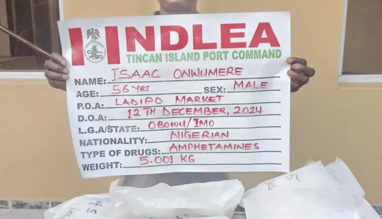 While one of the containers going to Ladipo market through the Sifax bonded terminal was examined on Thursday 12th December, not less than 5.001kg methamphetamine hidden in a bag wrapped in bed sheet that came in a Toyota Camry car, was recovered, even as a businessman, Isaac Onwumere linked with the consignment was promptly arrested.
