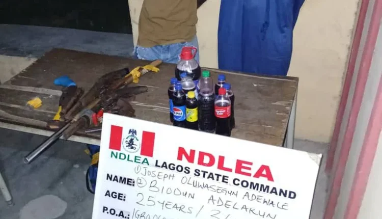 At least, two suspects: Joseph Oluwasegun Adewale and Biodun Adelakun were arrested at Igbo Olumo, Ikorodu area of Lagos when NDLEA operatives raided their hideout in the community where seven litres of skuchies, a new psychoactive substance produced with black currant, cannabis and opioids, were recovered. Other exhibits seized from the duo include: three locally made double barrel riffles; one locally made double barrel pistol; one English made pistol; one locally made single barrel riffle; three cartridges and one empty 9mm cartridge as well as an iron – head axe.