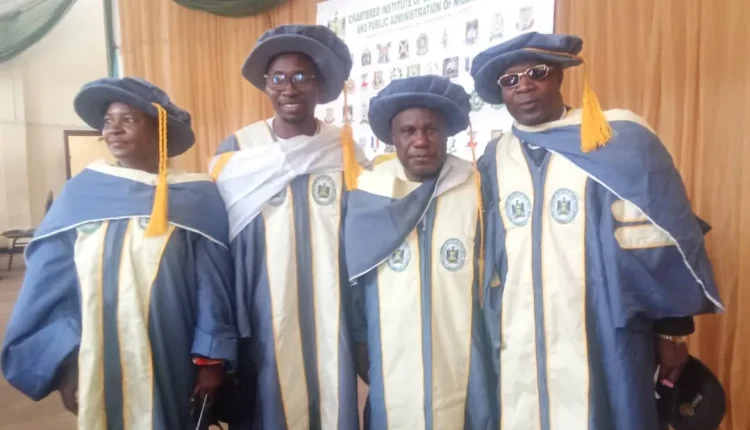 Senator Abdulfatai Buhari, PhD, (second right), Chairman, Senate Committee on Aviation with fellow inductees at their installation today, as Fellows of the Chartered Institute of Local Government and Public Administration of Nigeria, (FCPA), at the auditorium of The Polytechnic, Ibadan. The ceremony was presided over by FCPA Registrar, Dr Uche Okereke